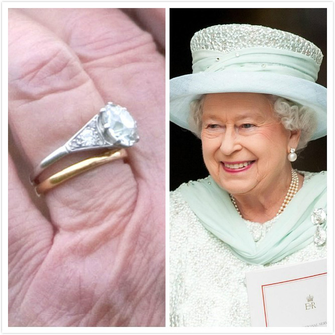 Như chiếc nhẫn đính hôn của Nữ hoàng Elizabeth II có khung nhẫn từ Platin đính những viên kim cương được làm từ vương miện của mẹ Hoàng tử Philip, Công chúa Andrew của Hy Lạp. Hoàng thân Philip đã thiết kế chiếc nhẫn đính hôn bằng kim cương cắt hình vuông với những viên kim cương trên khung nhẫn bằng Platin. Nữ hoàng vẫn đeo chiếc nhẫn này hàng ngày, kết hợp với chiếc nhẫn cưới bằng vàng xứ Wales của bà.