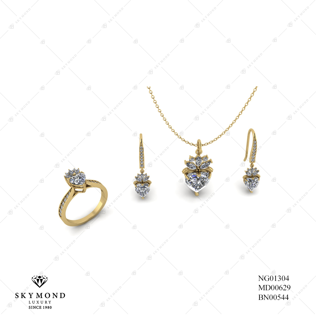 Dây chuyền MD00629, nhẫn nữ NG01304 của Skymond Luxury được làm từ chất liệu Vàng. Đặc biệt, thiết kế này được đánh giá cao bởi sự kết hợp Kim Cương hình trái tim tinh tế, thanh lịch, trẻ trung - đúng với xu hướng chủ đạo của năm 2020. Với bộ trang sức này, phái đẹp sẽ thêm phần tự tin khẳng định gu thời trang độc đáo và cá tính riêng biệt của mình.
