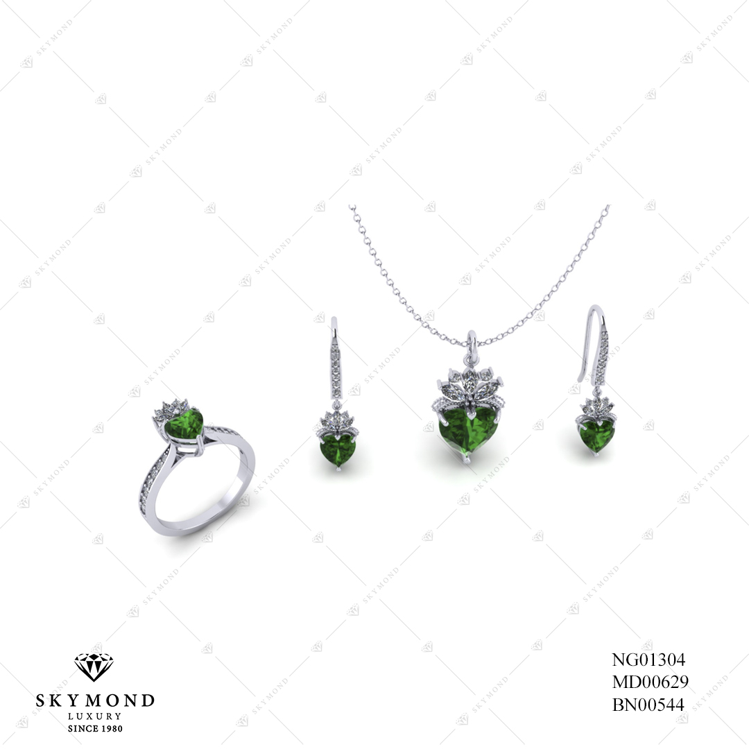 Dây chuyền MD00629, nhẫn nữ NG01304 của Skymond Luxury được làm từ chất liệu Vàng trắng. Đặc biệt, thiết kế này được đánh giá cao bởi sự kết hợp đá Emerald tinh tế, thanh lịch, trẻ trung - đúng với xu hướng chủ đạo của năm 2020. Với bộ trang sức này, phái đẹp sẽ thêm phần tự tin khẳng định gu thời trang độc đáo và cá tính riêng biệt của mình.