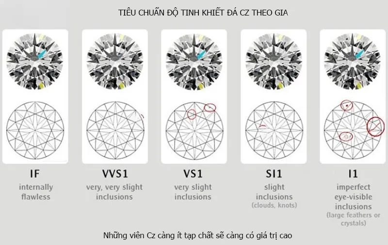 Vì được nuôi cấy trong môi trường kiểm soát, đá CZ đạt được độ tinh khiết gần như tuyệt đối, không có bất kỳ bao thể (tạp chất) nào. Điều này tạo nên một "nước đá" trong vắt, tương đương với nước D cao cấp nhất của kim cương.