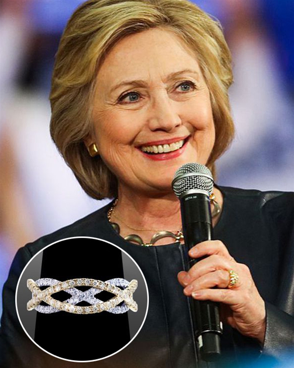 Bà lựa chọn cho mình món trang sức yêu thích được chế tác từ Platin và Kim Cương. Chiếc nhẫn do Vanessa Nicole thiết kế đã khéo léo kết hợp thêm chi tiết vàng vàng để tăng thêm vẻ độc đáo và gửi gắm tinh thần và mục tiêu của bà Hillary: Hòa bình – Thống nhất – Trường tồn.