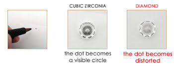 Nếu bạn dễ dàng nhìn thấy một vòng tròn phản chiếu dấu chấm thì đó chính là viên CZ (viên đá nằm bên trái). Ngược lại, viên bên phải là kim cương thật. Một viên kim cương sẽ phân tán phản xạ của ánh sáng lên dấu chấm và bạn hầu như không thể nào nhìn thấy dấu chấm đó được.