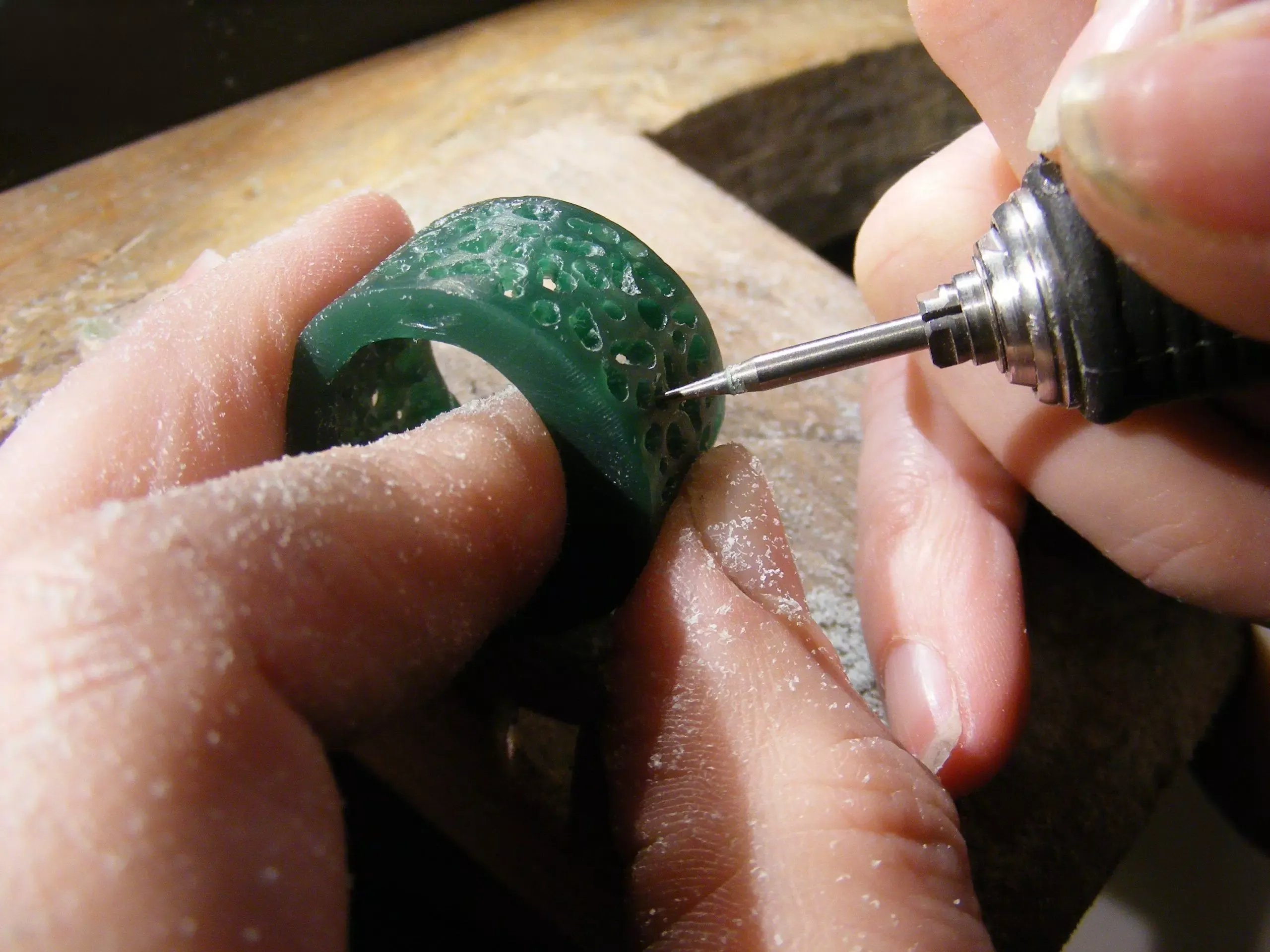 - In mẫu sáp Resin siêu phân giải: Sử dụng máy in 3D công nghệ DLP giúp bề mặt mẫu sáp láng mịn tuyệt đối. Mẫu sáp này là bản sao hoàn hảo 1:1 của chiếc nhẫn thật.