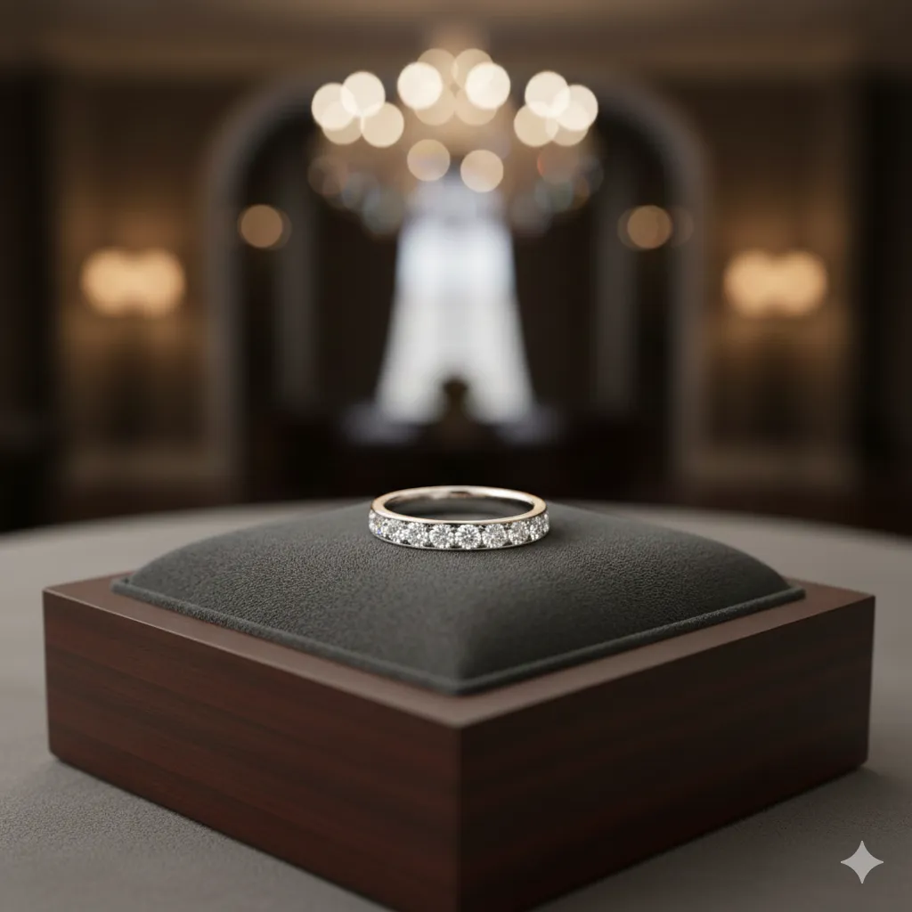 - Half Eternity: Kim cương chỉ được đính ở nửa trên của đai nhẫn (thường là 50% hoặc 75%). Đây là một sự biến tấu thực tế hơn, giúp người đeo dễ dàng điều chỉnh kích cỡ nhẫn (size tay) và mang lại cảm giác thoải mái hơn khi cầm nắm.