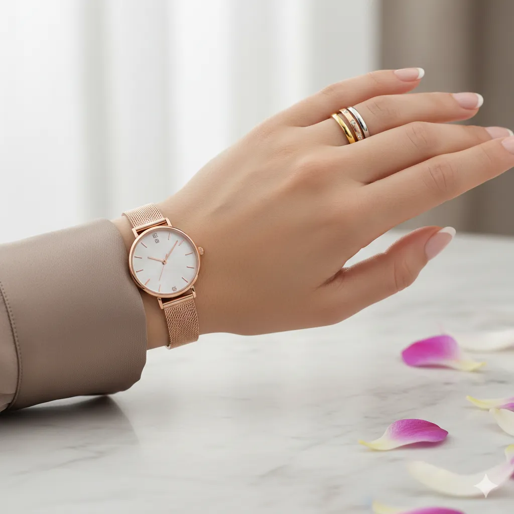 Nếu bạn đeo đồng hồ dây da màu nâu (hợp vàng vàng) nhưng lại thích đeo vòng tay bạch kim (hợp vàng trắng), chiếc nhẫn phối màu sẽ là cầu nối hoàn hảo giúp tổng thể phụ kiện trên tay bạn không bị lạc quẻ.