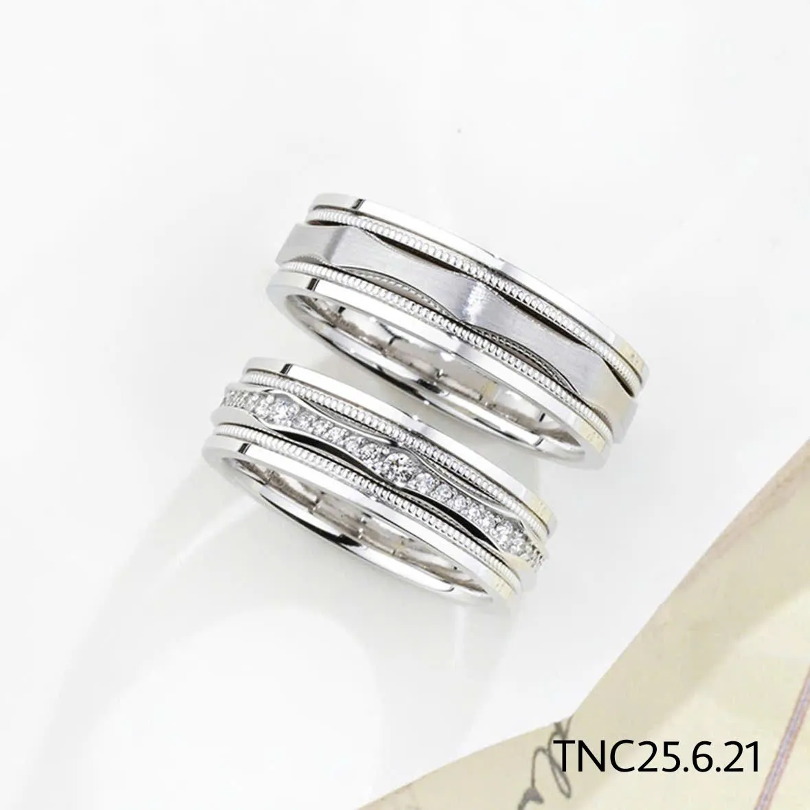 Phong cách: Nam tính cho chú rể và hiện đại cho cô dâu. Đây là mẫu nhẫn cưới đính kim cương cực kỳ bền bỉ và dễ sử dụng trong công việc hàng ngày.