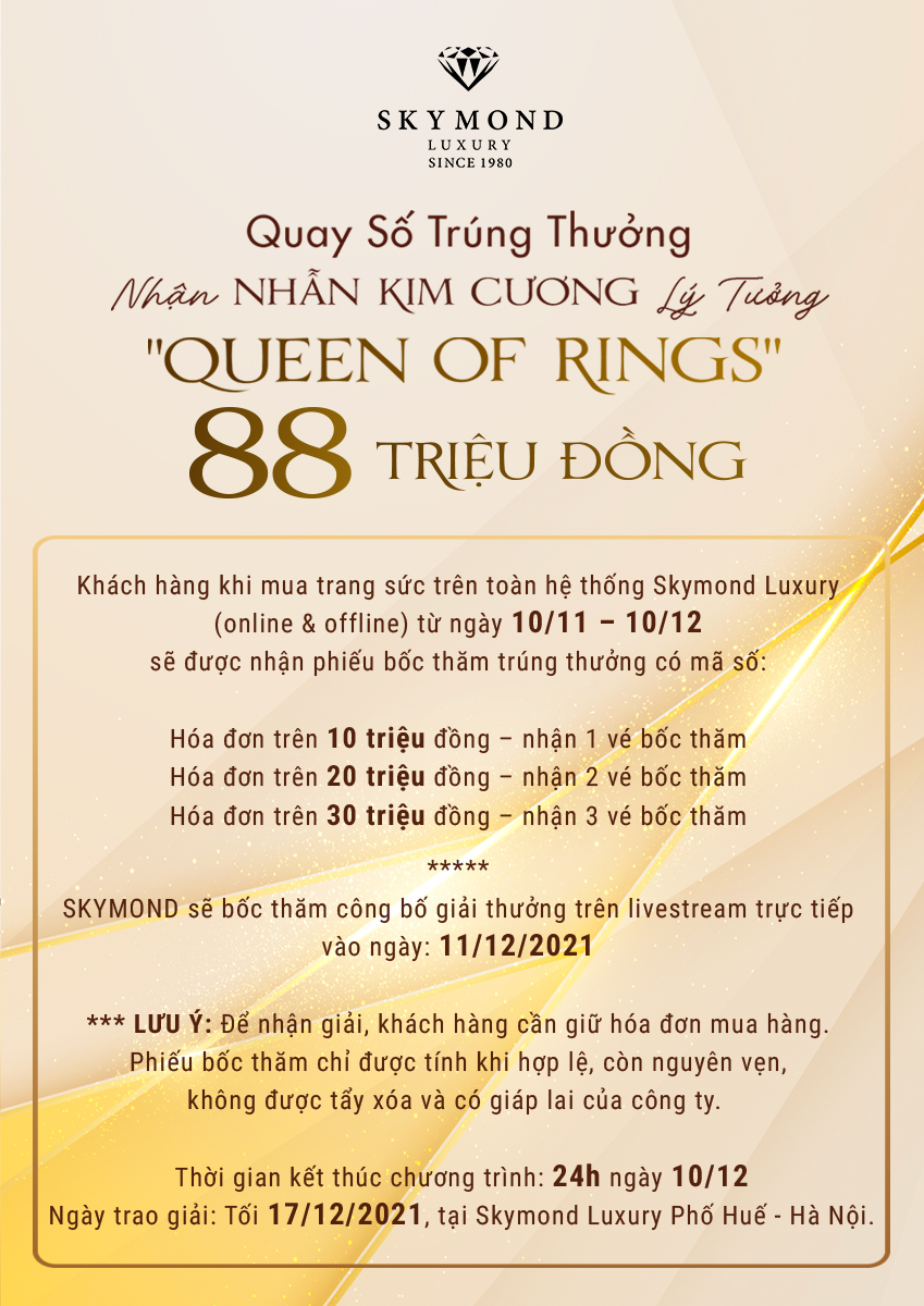Khách hàng khi mua trang sức trên toàn hệ thống Skymond Luxury (online & offline) từ ngày 20/11 – 20/12 sẽ được nhận phiếu bốc thăm trúng thưởng có mã số.