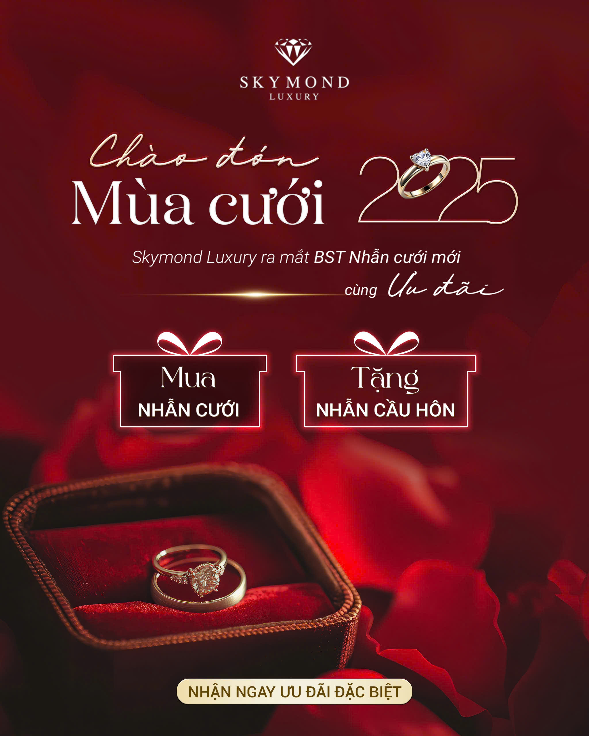 Thật tuyệt vời khi mùa cưới 2025 đang đến thật gần. Để đón mừng mùa cưới năm nay thật rực rỡ, Skymond Luxury ra mắt BST Nhẫn cưới mới với phong cách hiện đại, sang trọng từ những nguyên liệu quý giá nhất hành tinh như Platin, Vàng, Kim Cương.