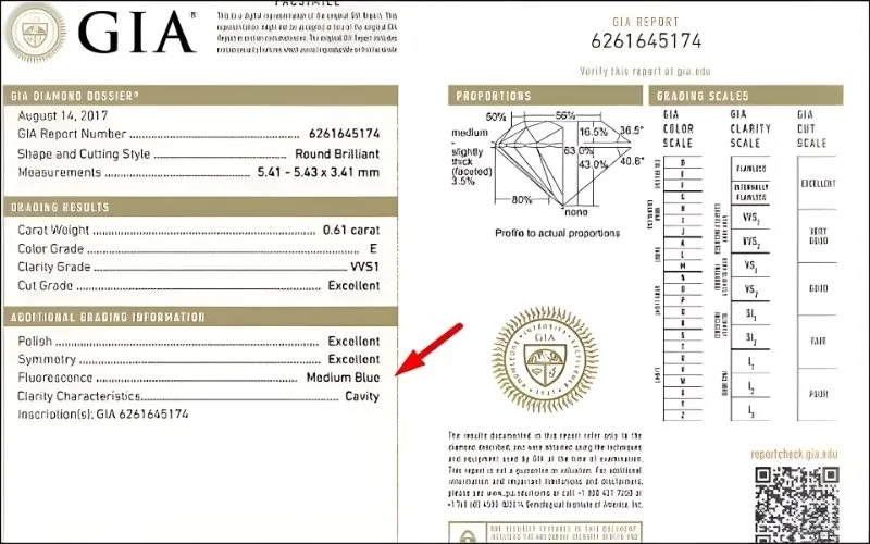 - Nhiều người e ngại "Fluorescence", nhưng thực tế, với kim cương nước màu thấp (I, J, K), huỳnh quang xanh (Medium hoặc Strong Blue) thực chất lại giúp viên kim cương trông trắng hơn so với thực tế.