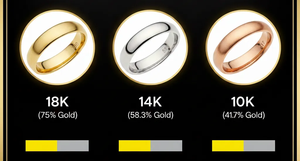 Ví dụ, hàm lượng vàng trong nhẫn cưới 18k sẽ là: $18/24 \times 100 = 75\%$. Phần 25% còn lại là "hội" (Alloy) bao gồm bạc, đồng, palladium...