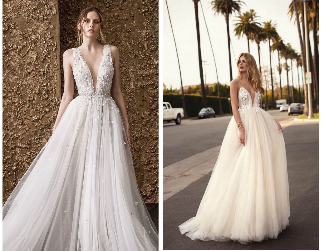 Những cô dâu sở hữu dáng người quả táo nhất định không được bỏ qua thiết kế cổ áo này. Váy cưới cổ áo chữ V tạo cảm giác thanh mảnh hơn và giúp cô dâu thu hẹp phần thân trên.